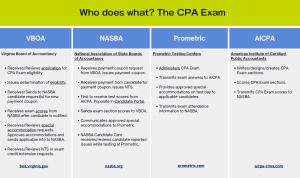 Quy trình thi CPA là sự hợp tác giữa các hội đồng kế toán tiểu bang, Viện Kế toán Công chứng Hoa Kỳ, Hiệp hội các Hội đồng Kế toán Tiểu bang Quốc gia và Prometric. Xem biểu đồ này để biết thêm chi tiết.