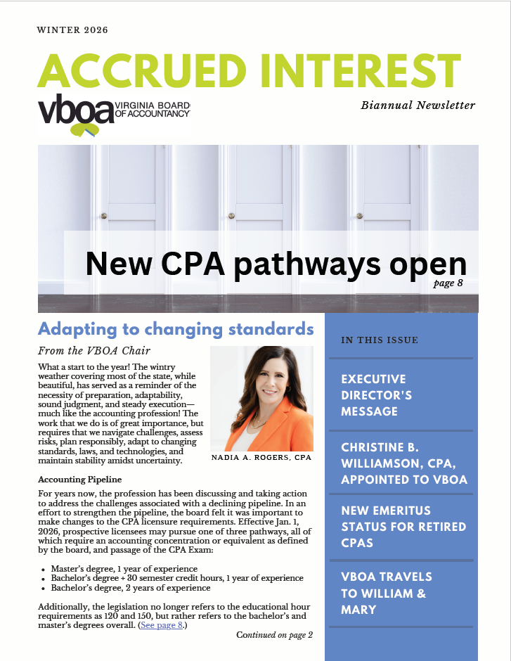 VBOA xuất bản bản tin hai lần một năm với nhiều tin tức và thông tin cập nhật liên quan đến cộng đồng CPA và ứng viên dự thi của Virginia, cùng với các hành động kỷ luật.